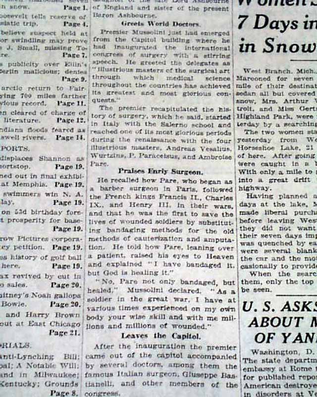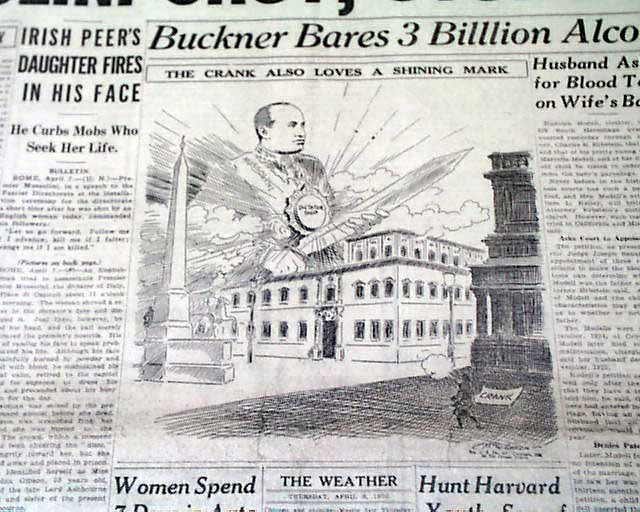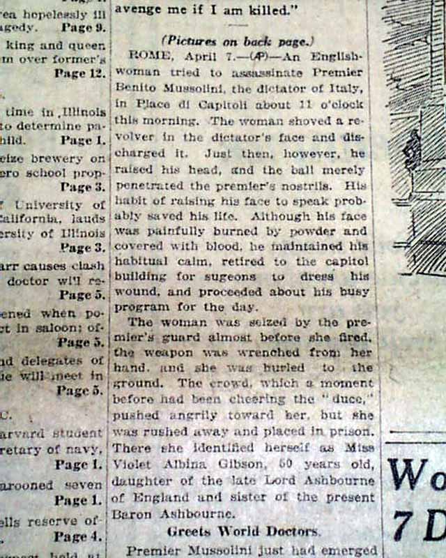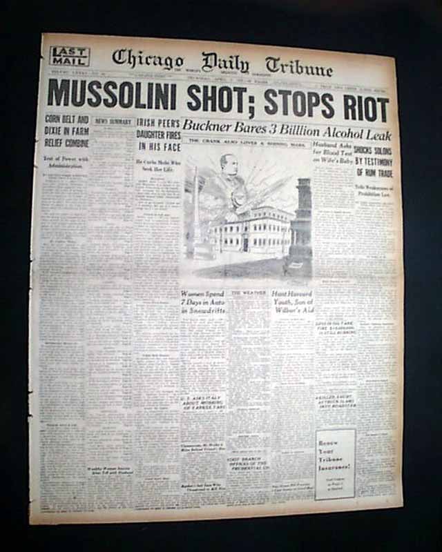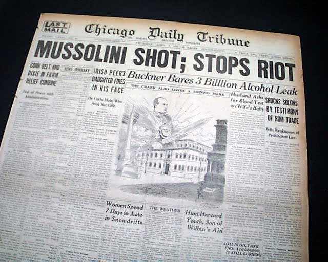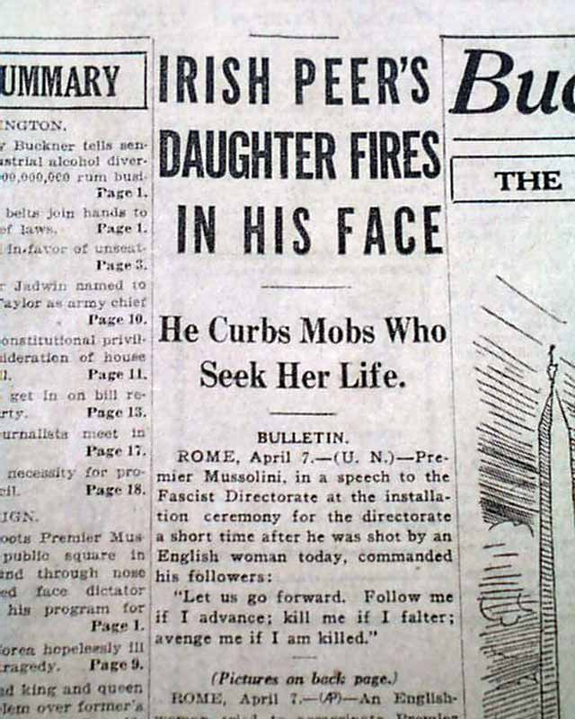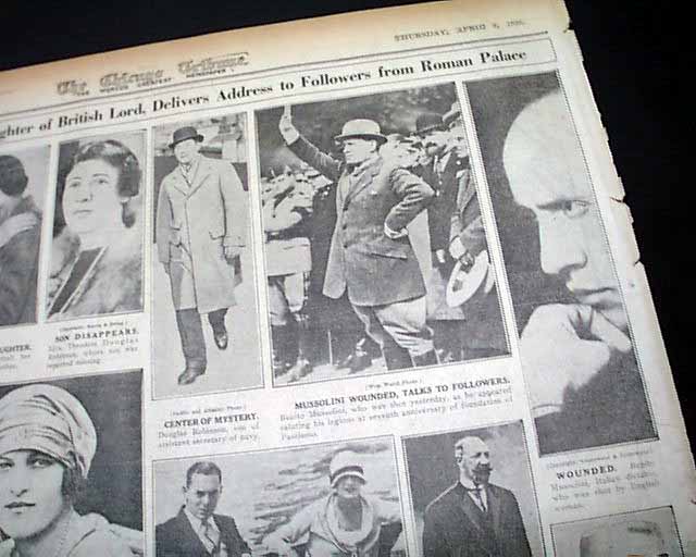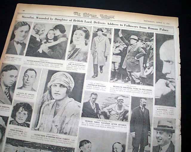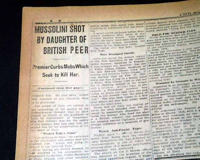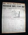 The front page has a nice banner headline: "MUSSOLINI SHOT; STOPS RIOT" with subheads and related illustration. (see images) A few related photos are on the back page.