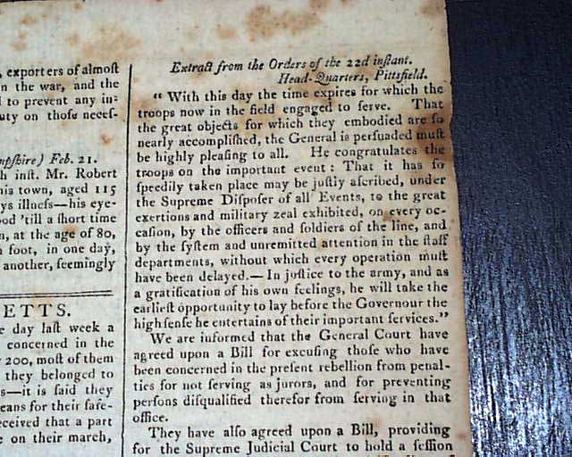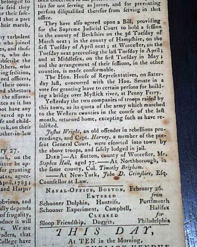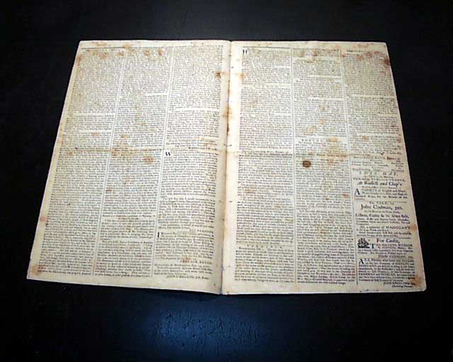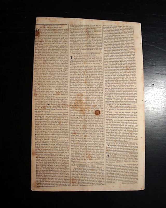 Published by Isaiah Thomas, perhaps the most famous printer of the 18th century, and whose collection became the foundation of the American Antiquarian Society. Handsome masthead makes this a displayable newspaper.