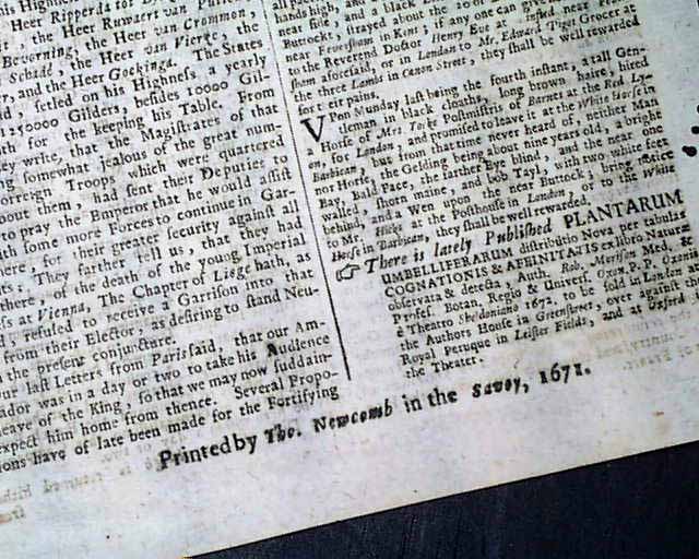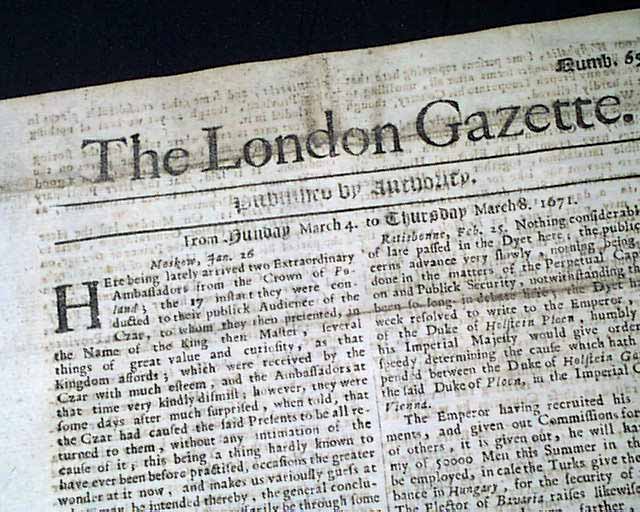 Genuine London Gazette newspaper from 1671...