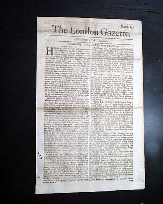 This is the world's oldest continually published English language newspaper, having begun in 1665 and is still printing in London to this day. And this is a very early, genuine issue. As was the case with most newspapers of the 17th century, this is complete as a single sheet, measuring 6 1/2 by 10 3/4 inches and printed on very high quality paper with much cotton & linen fiber content.